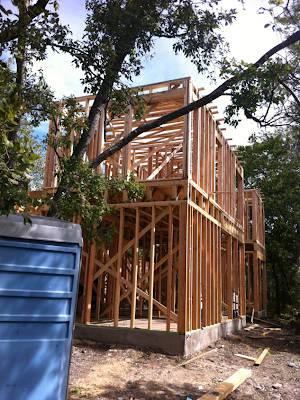 Was able to stop by the house over lunch and take some daylight photos. The guys were there laying the roof trusses in their approximate homes. Since the guys were there (and on a break), I was able to climb the ladder and gawk and gander at the world from ~12 feet above grade. Purdy cool...