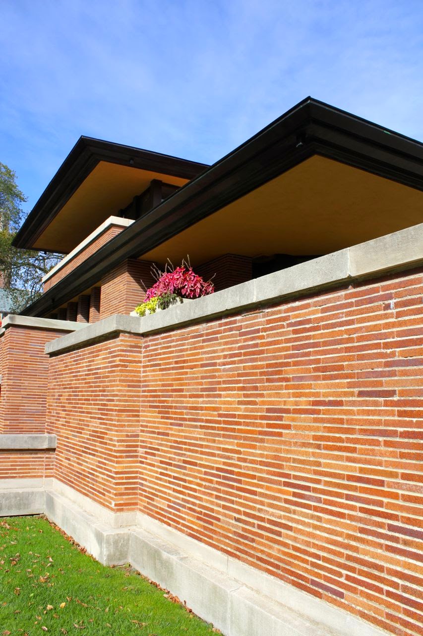 Detail of the brickwork. Wright was fixated on the horizontal. The bricks themselves are longer than normal, and then Wright also specified that the vertical seams between the brick be flush with the brick and of a similar hue.
