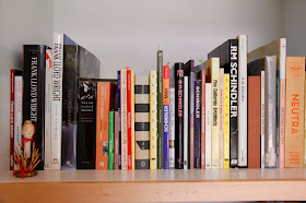 With the bride and I having something of an affinity for books (we have about a 1,000 of them in the house), the program for our house required a place for books. As noted above by the original arbiters of the Modern aesthetic, Hitchcock and Johnson, books are an appropriate decoration for a Modern house. However, they were probably influenced by their own bookish ways (book people are always fond of displaying their books, whether for ease of access or ease of impressing guests). Books can be rather visually messy, the opposite of minimalism. Others suggest that, in affairs of the heart, a person that doesn't display evidence of bookishness is not worthy of (ahem) rigorous attempts at procreation.
