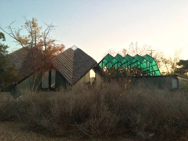 I was also able to stop in at the Pollock House (1957) in northwestern Oklahoma City. When I pulled down the street, I thought to myself "Surely the address is wrong..." because the neighborhood is late-80s to early-90s suburbia, but there it was, all the more glorious given its surroundings, teepee-ish in its dusking glory. My photos are awful: incentive to come back again (and also see the Goff-designed church nearby). The black-and white photos below are from the National Register of Historic Places documents.