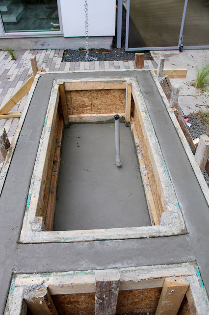 Smoothed out and coming together! The space in the foreground is the pond; the area toward the rear is a planter. I feared that perhaps the pond would be too shallow, but as it's coming together, it looks good. The landscaper worried that perhaps the planters themselves were too short. We designed them also to serve as seats and places to set drinks. They'll work. Low-slung works with the house as well.