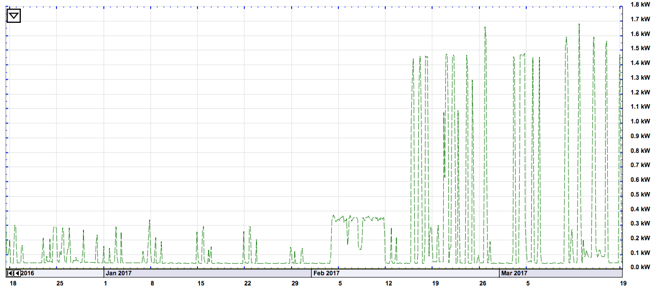 The upticks in electric usage on this circuit are from charging the i3. It pulls 1.4 to 1.7 kW when plugged.